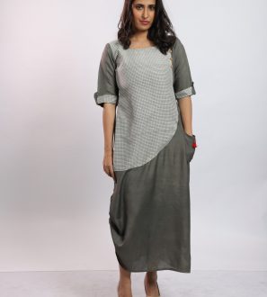 • Grey Khadi Bagru Print Long Cotton Kurti