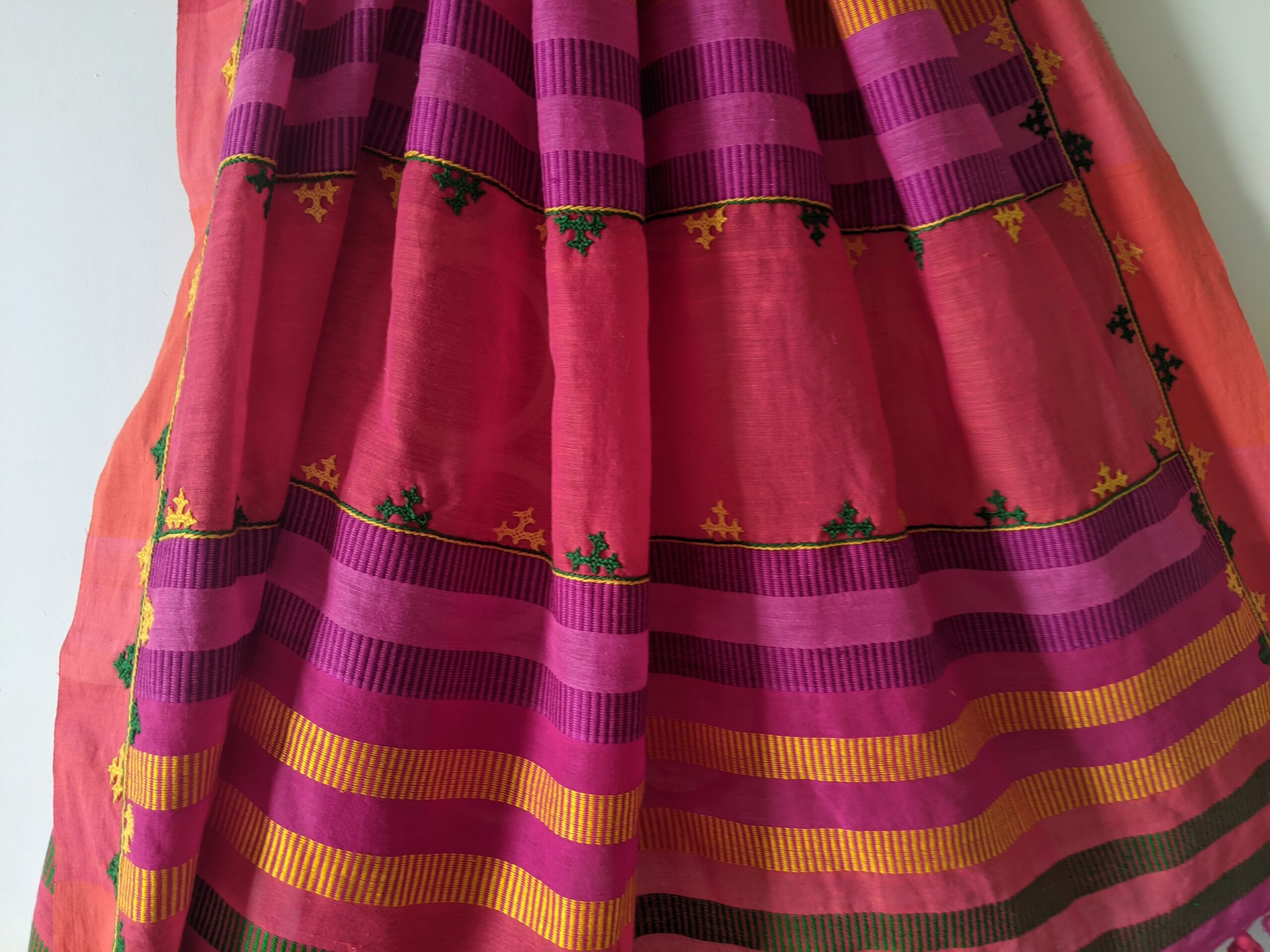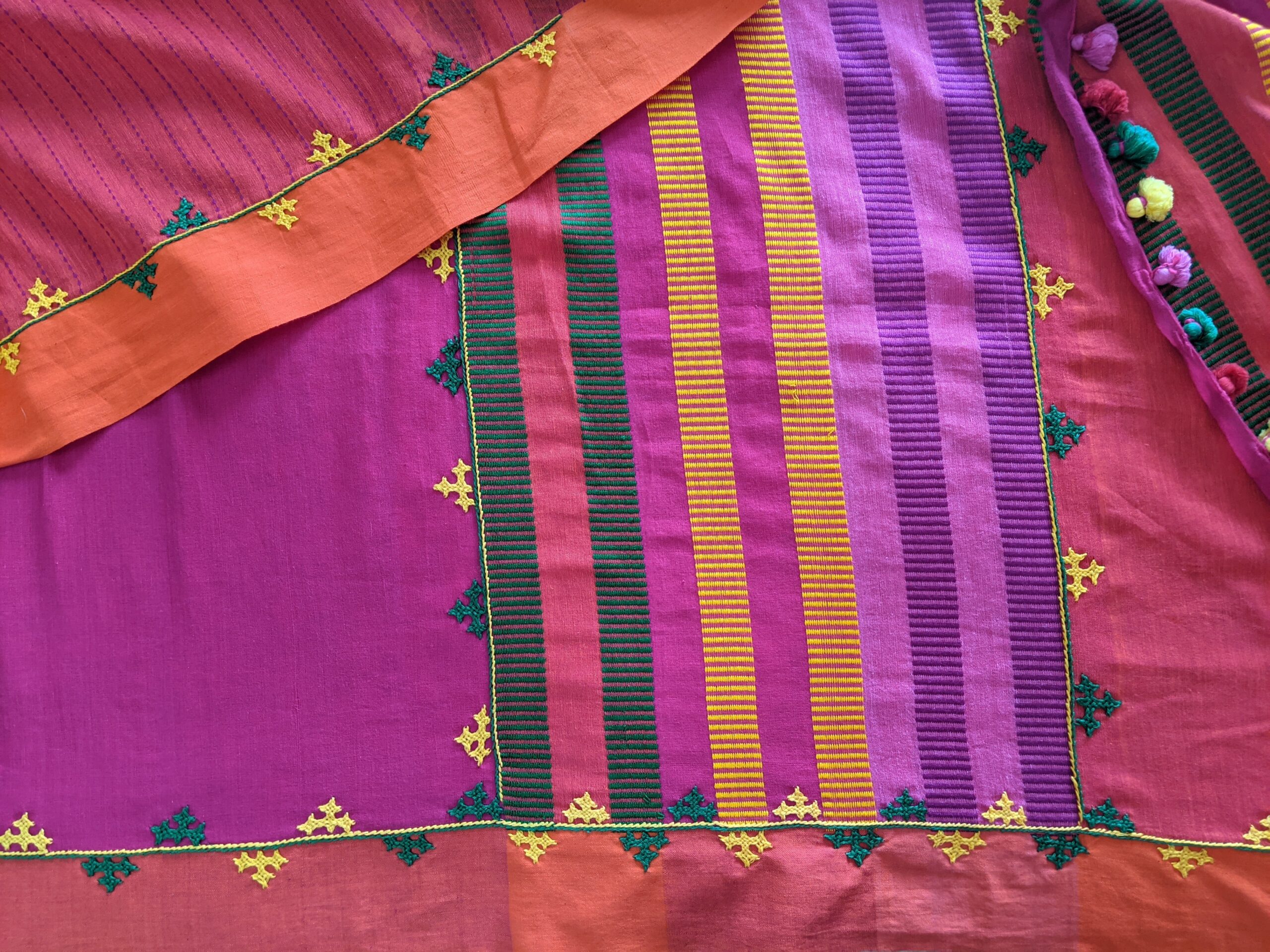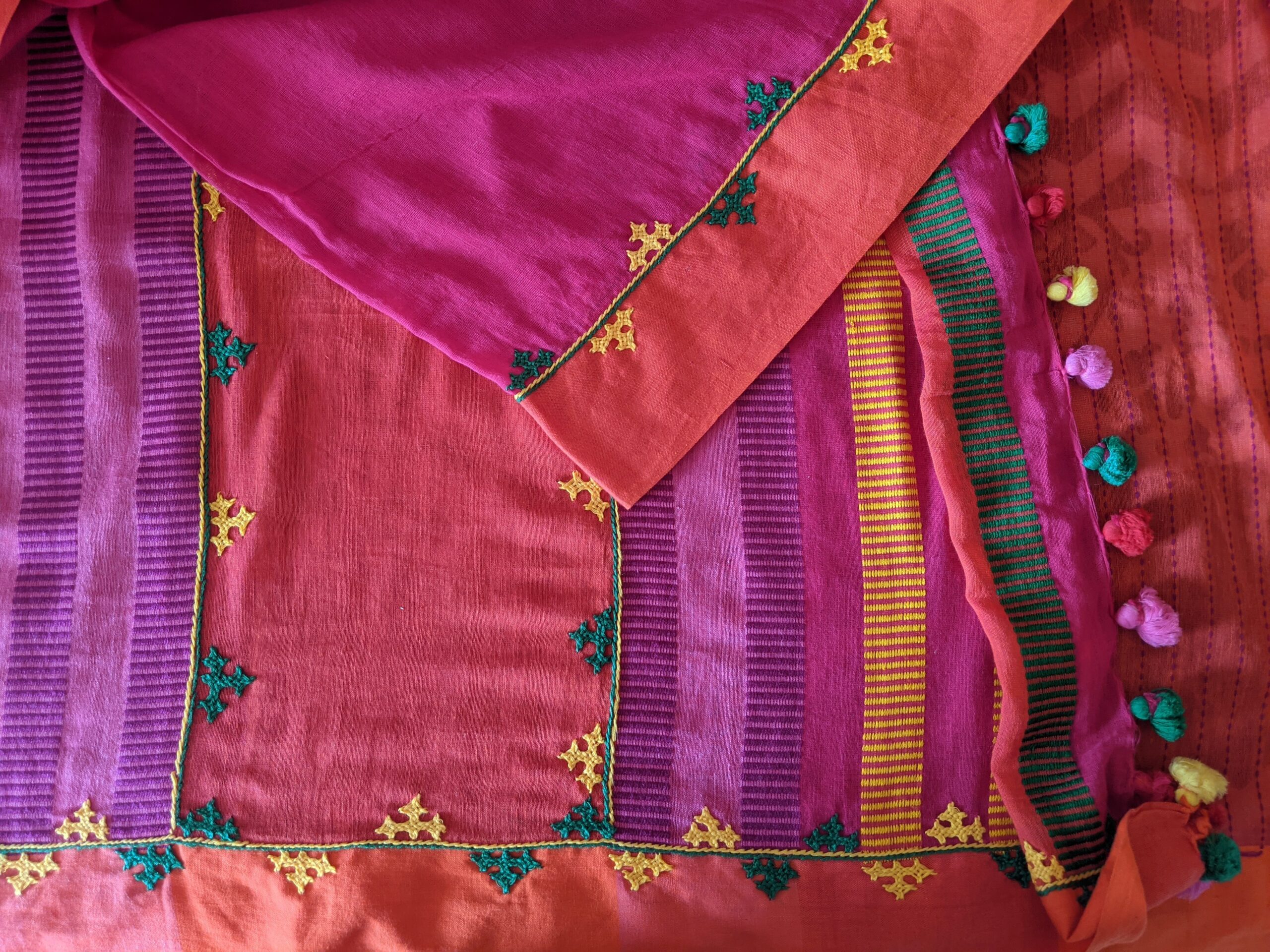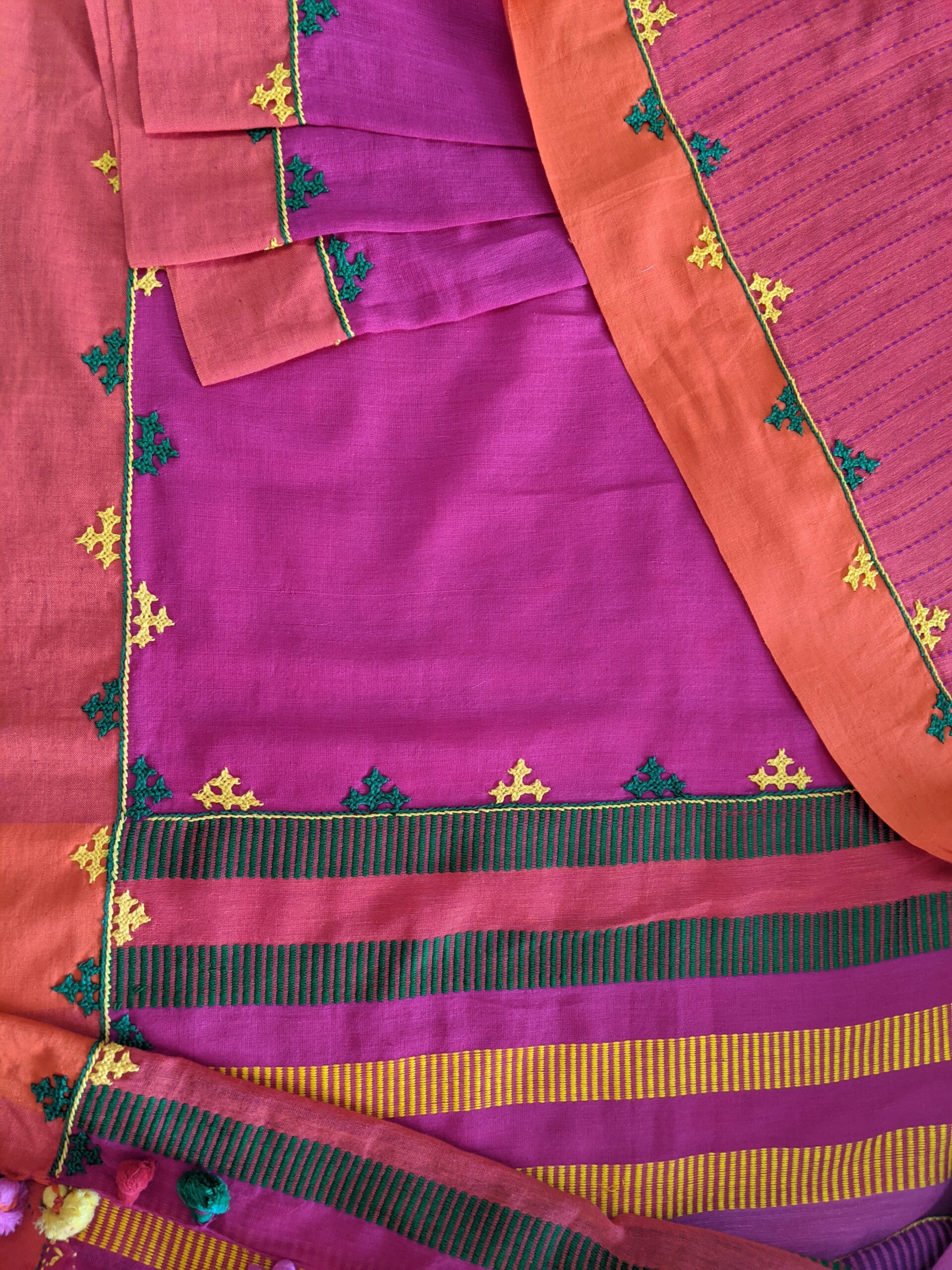 ABOUT THE SARI – This vibrant sari in pure handloom cotton from Begumpur has bright Kutchi embroidery all over the borders and Palav . Contrasting bright thread work, woven on palav makes it festive. Traditional look is complete with tassels.