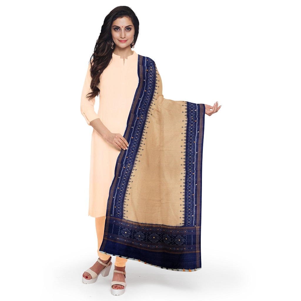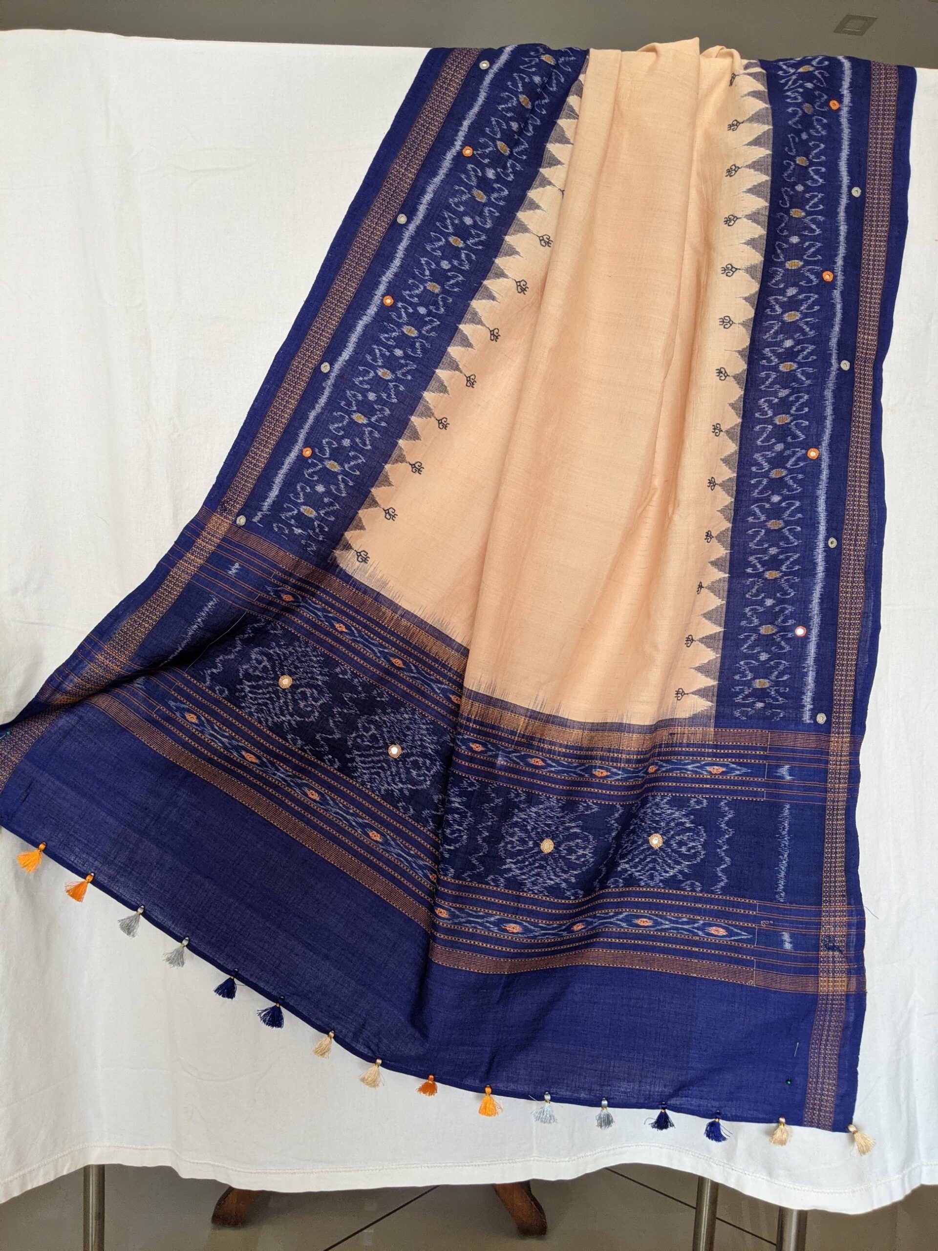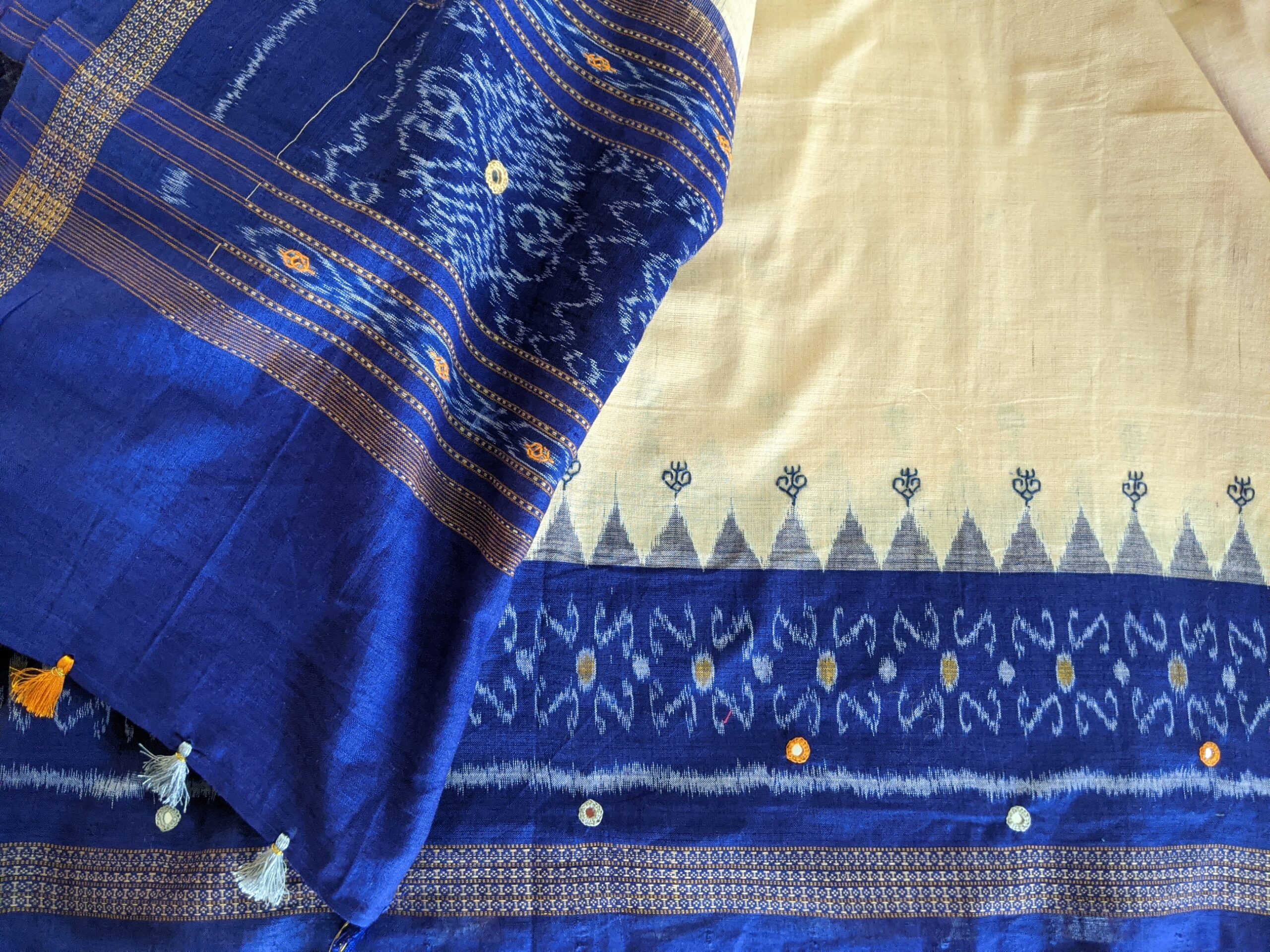 ABOUT THE DUPATTA – Ikat handloom cotton with Kasuti hand embroidery and Abla work. Tassels to match