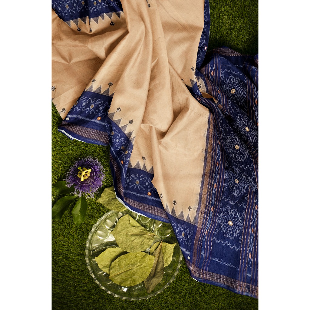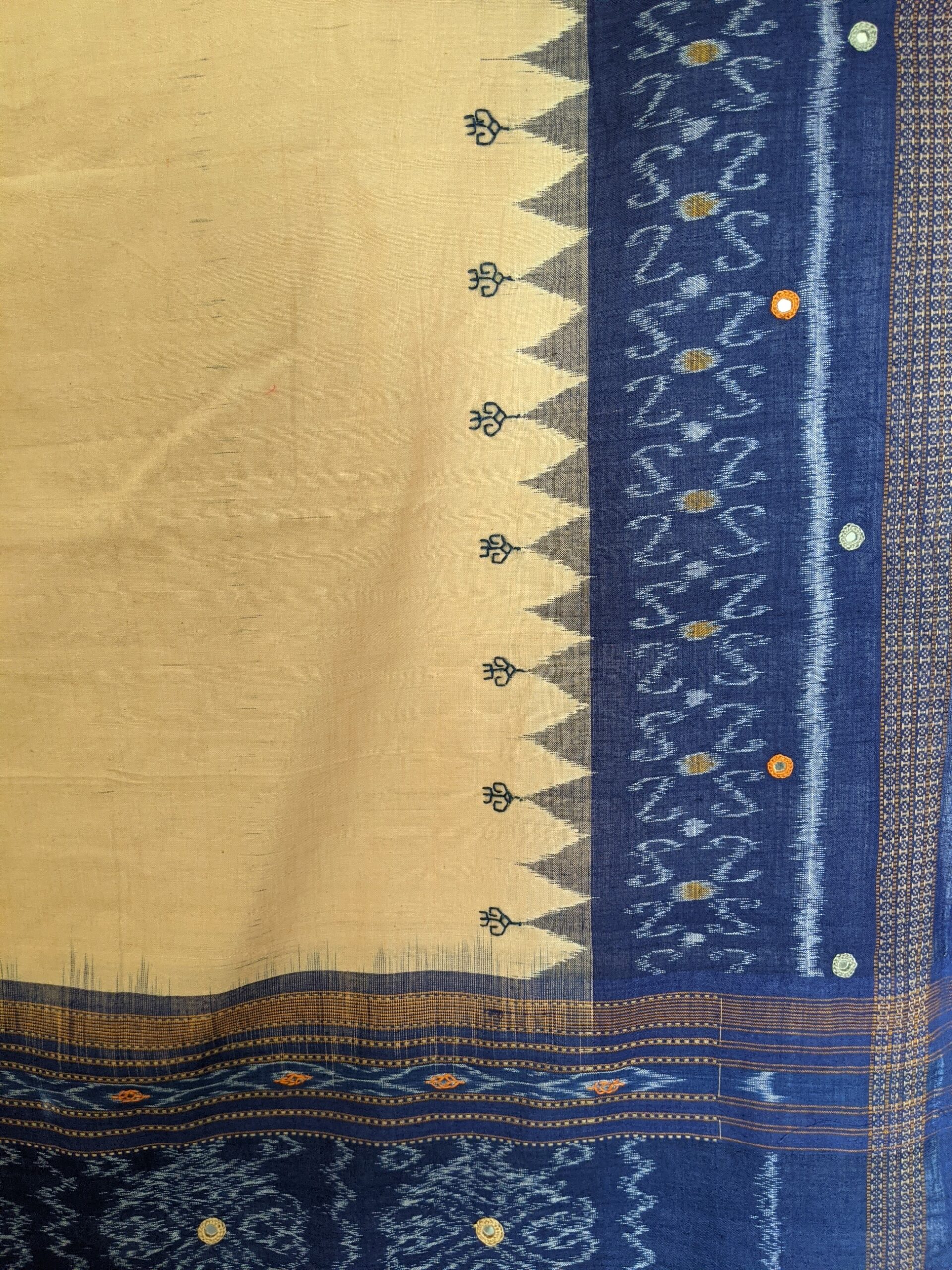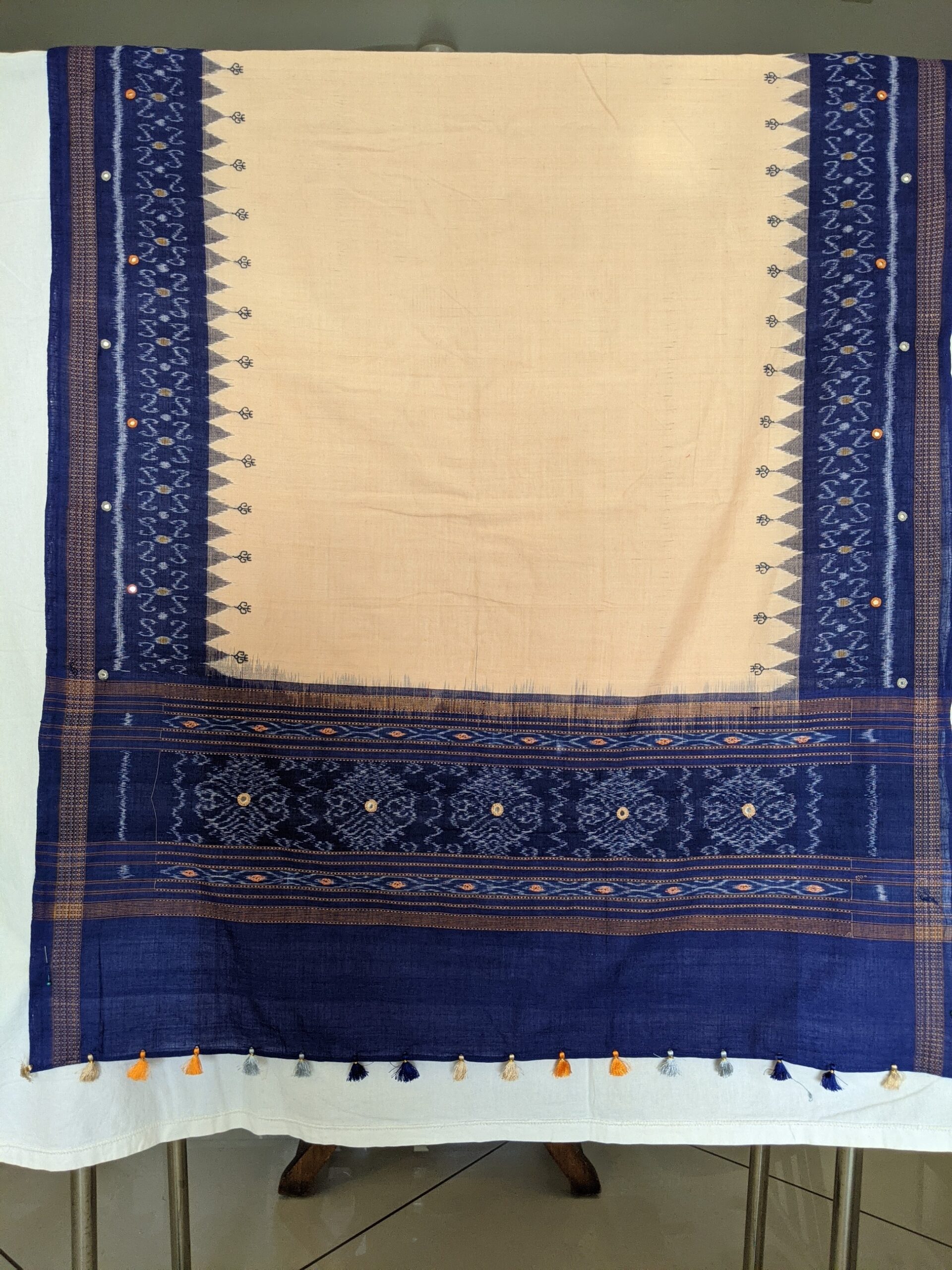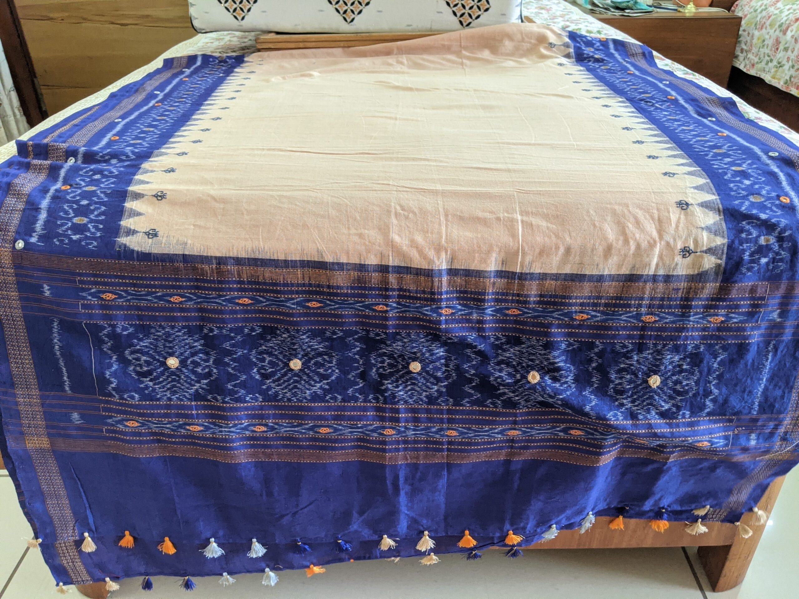 ABOUT THE DUPATTA – Ikat handloom cotton with Kasuti hand embroidery and Abla work. Tassels to match