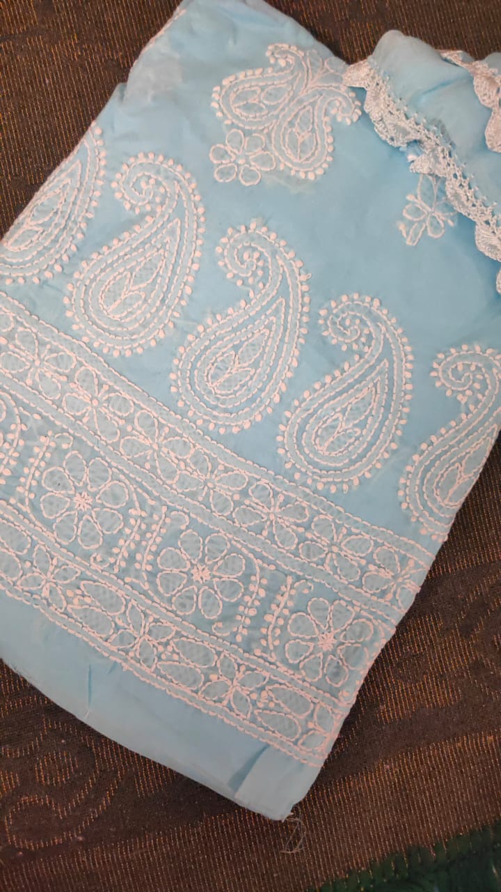 Unstitched cotton top n bottom with fine white thread chikankari.